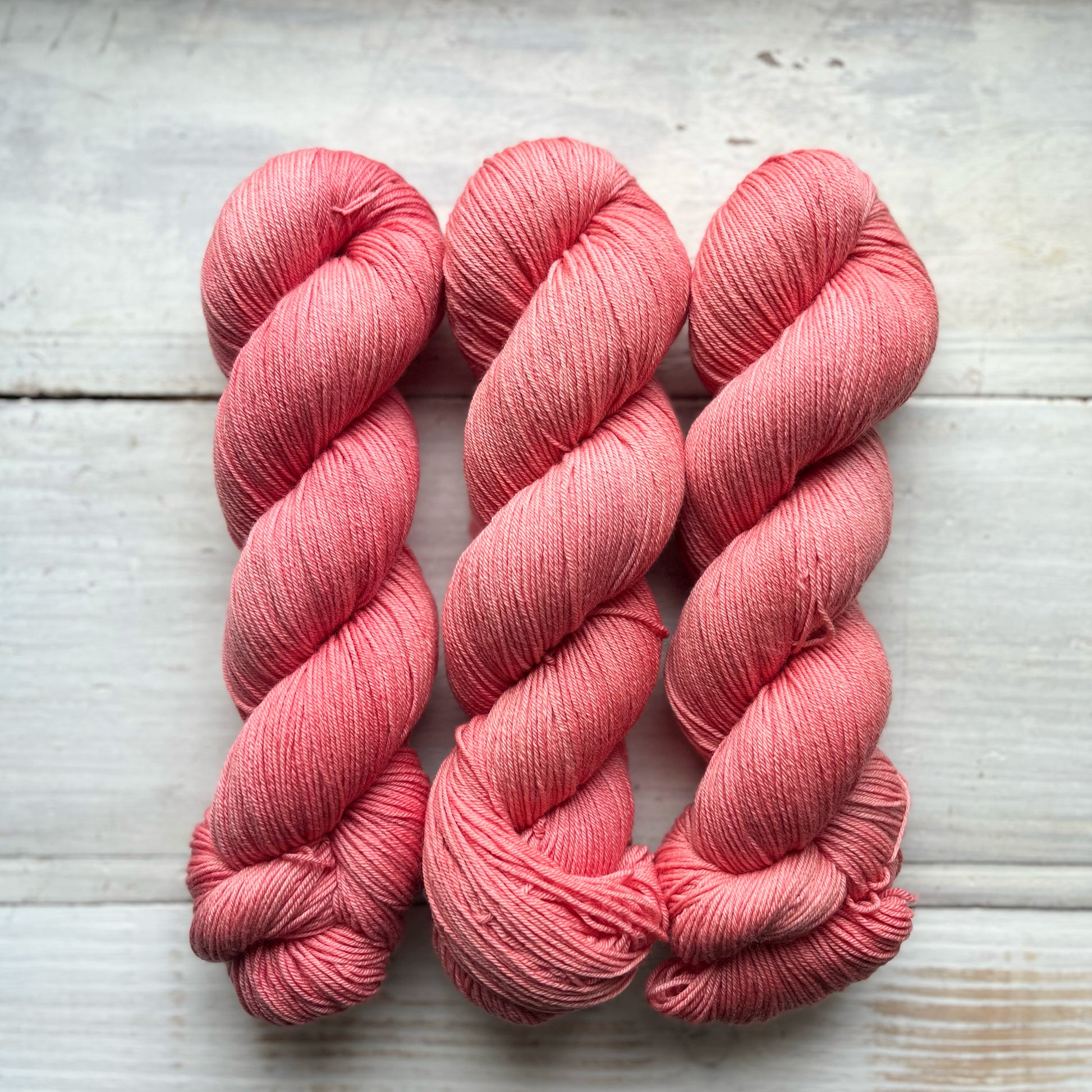 One of the first bases offered by L'Écheveau Solidaire, a 100% non-superwash merino fingering weight, was replaced by the Solstice base when it was discontinued by the supplier.