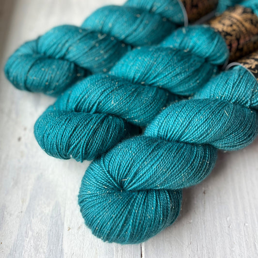 Composition: 75% superwash merino, 20% nylon, 5% Stellina GOLD