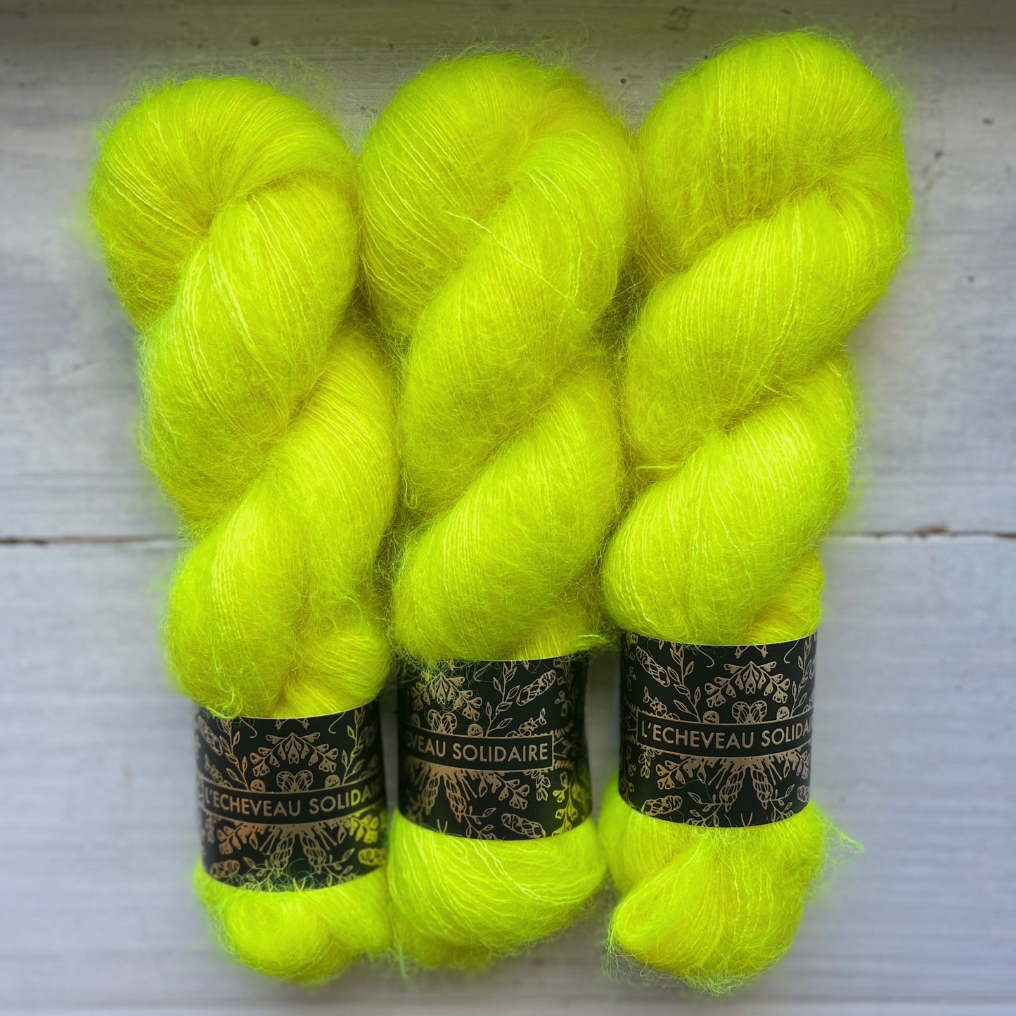 Elle est composée de kid mohair, (une fibre très douce et fine) qui provient de jeunes chevreaux. Le kid mohair est associé à de la soie, qui apporte un coté brillant au fil.