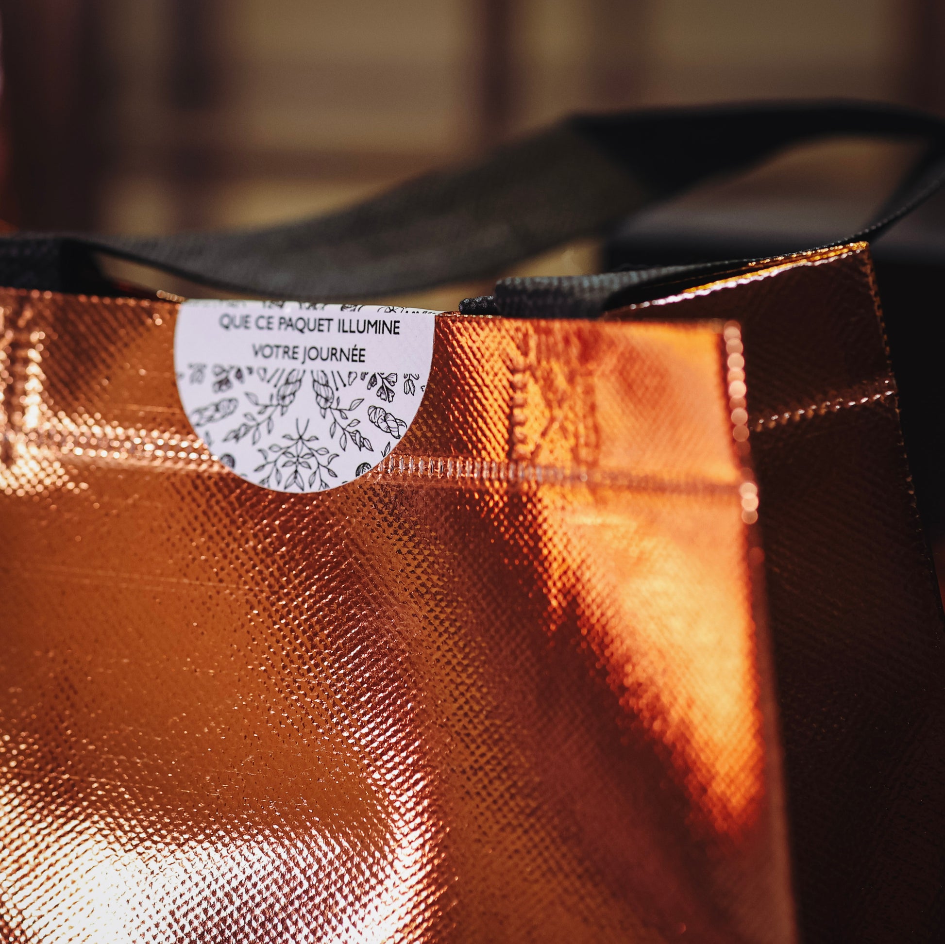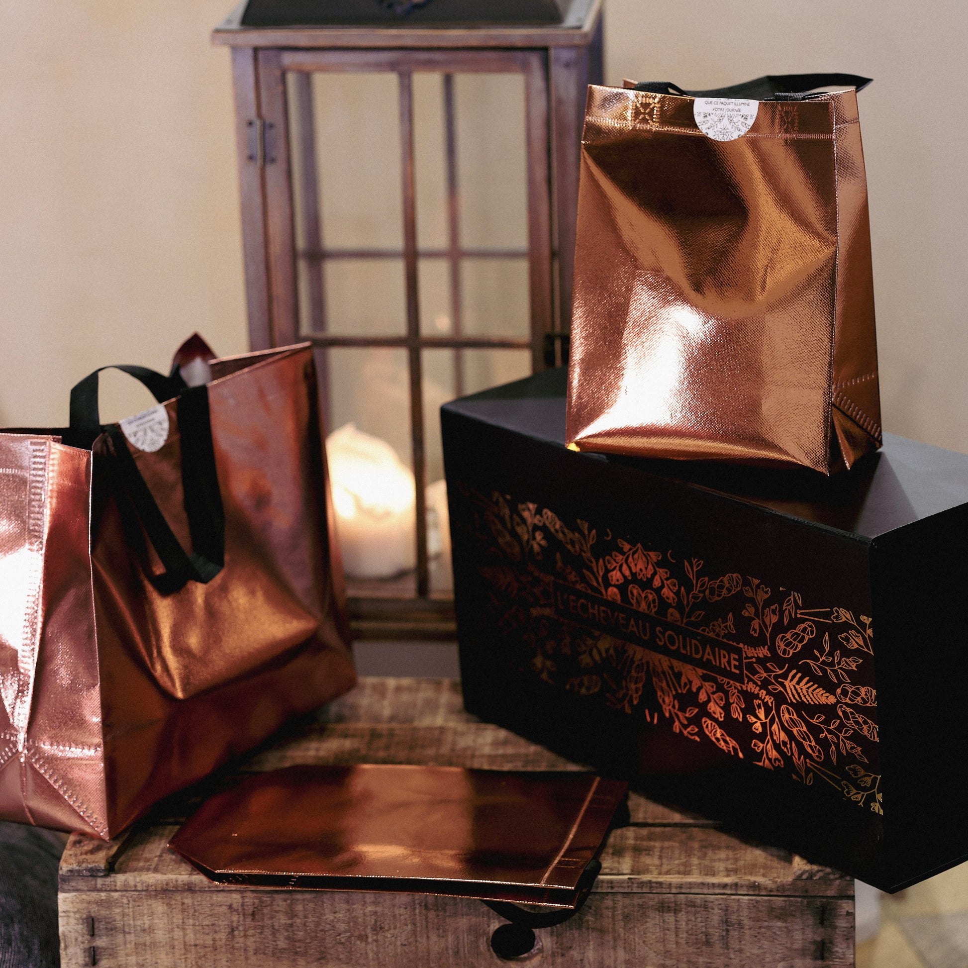 La laine ou les objets seront enveloppés dans du papier de soie avec un joli autocollant, le tout mis dans un sac réutilisable coloris métal cuivré.