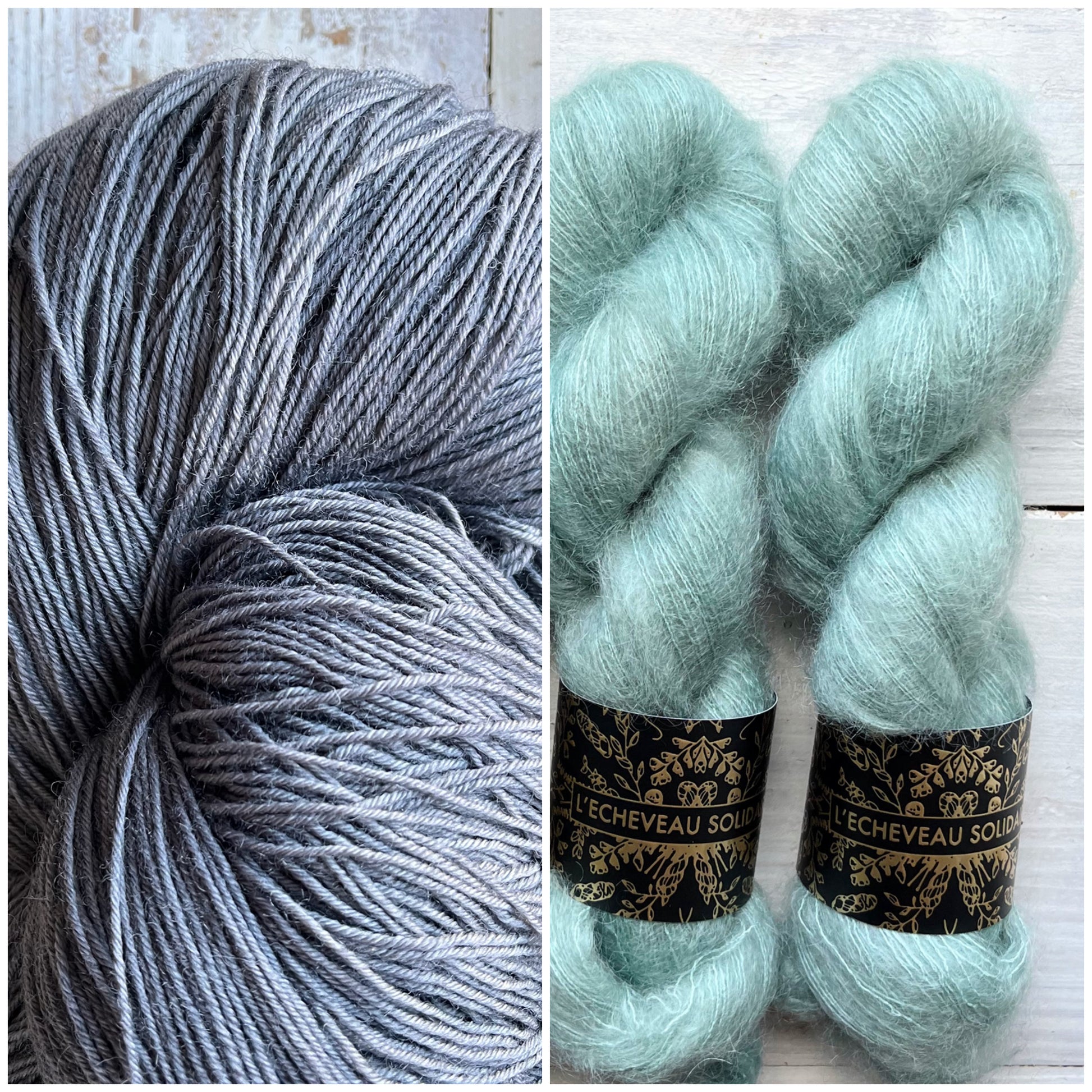 Ce kit est composé de 500g de laine Météorite (100% corriedale) + deux écheveaux de 50g d'Atmosphère (72% kid mohair - 28% soie).